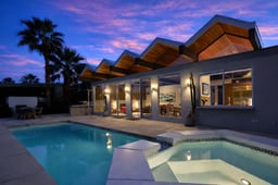 Set within an intimate enclave of just six architecturally cohesive residences, this striking home captures the essence of Palm Springs modernism through a sculptural folded-plate roofline inspired by the iconic design language attributed to Palmer & Krisel, where geometry, light, and landscape exist in perfect balance.From the moment you arrive, the experience is intentional. A private front courtyard, anchored by a linear water feature and framed by curated desert plantings, creates a sense of calm and quiet sophistication. It is both architectural and meditative, offering a compelling preview of the design narrative that unfolds within.